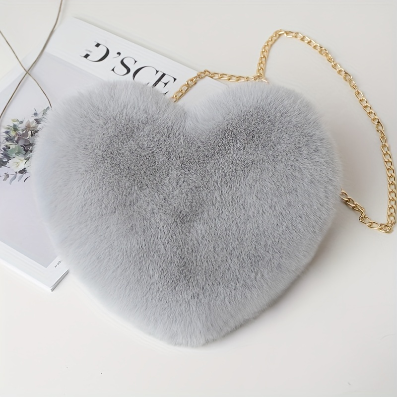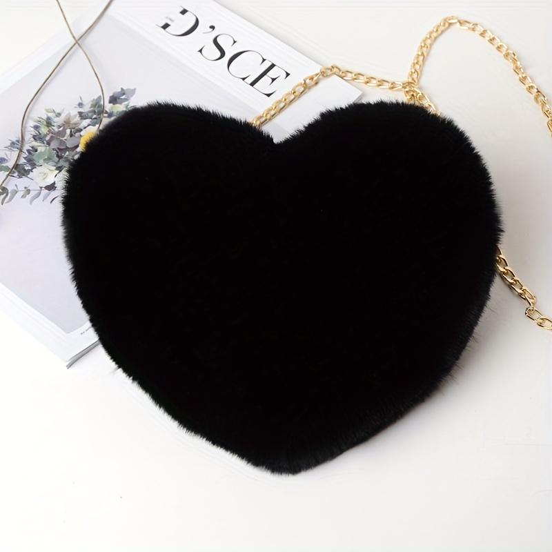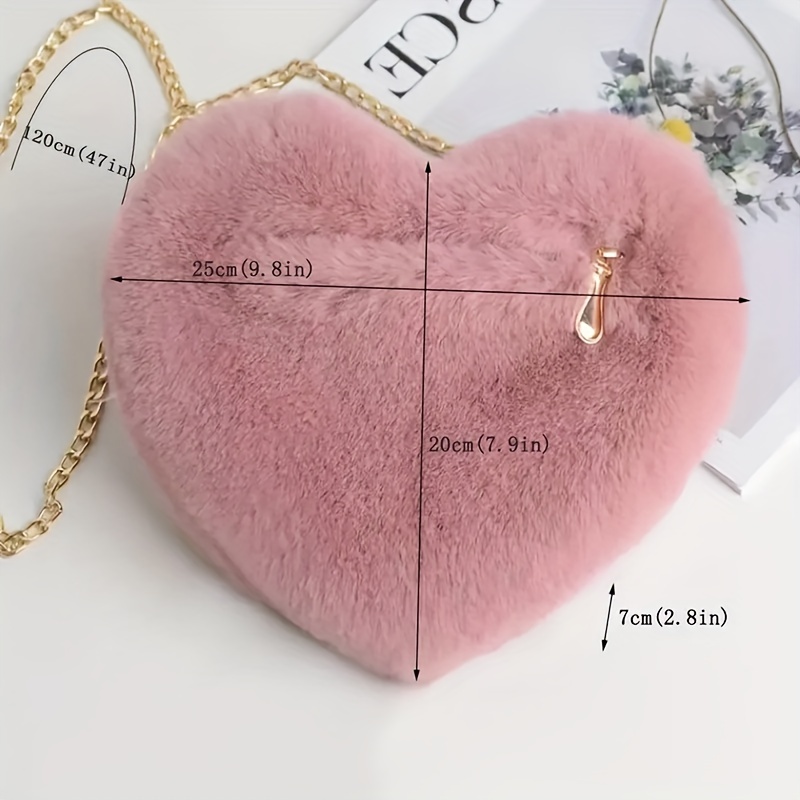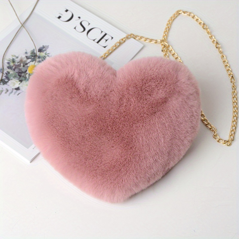 • Plush Heart Shaped Crossbody Bag, Fashion Chain Shoulder Bag, Women's Faux Fur Love Purses